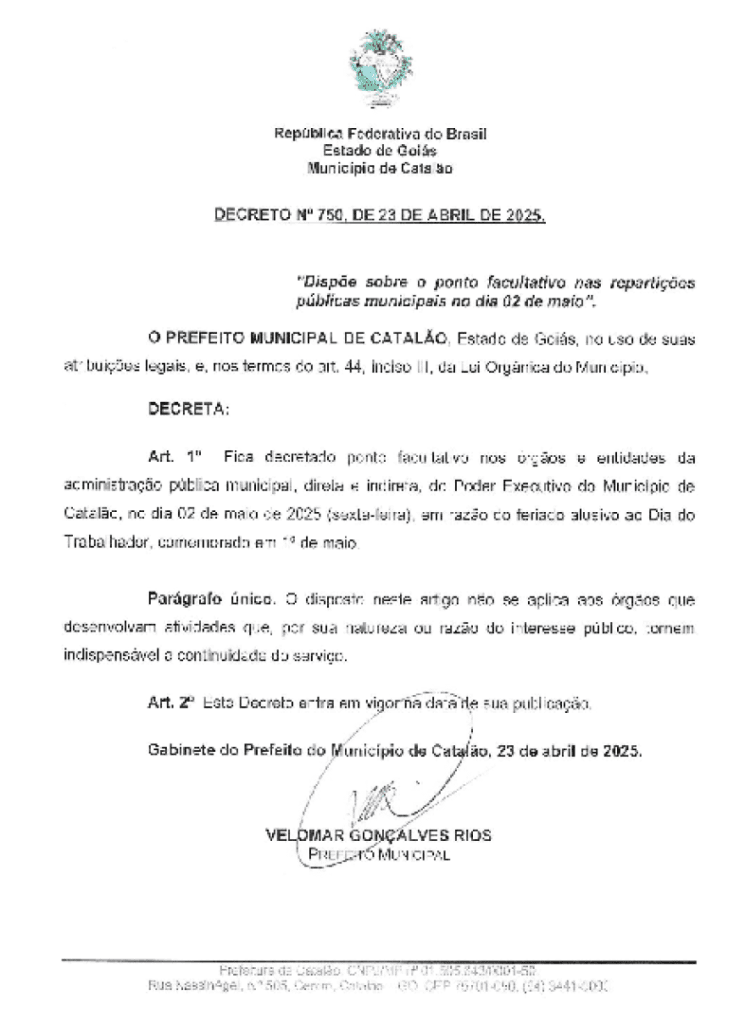 315 Medida é em razão do feriado alusivo ao Dia do Trabalhador, comemorado em 1º de maio 0 comentario 0 FacebookTwitterWhatsappEmail admin post anterior Comissão aprova projeto que simplifica concessão de benefício para agricultor familiar prejudicado por estiagem – Notícias próximo post Governo entrega obras no Vale do São Patrício Você pode interessar! Debatedores pedem que STF garanta auxílio a vítimas... Abril 17, 2026 Homem persegue meninas e provoca medo no campus... Abril 16, 2026 Miss e influencer: saiba quem é a goiana... Abril 16, 2026 Ministério Público abre ação contra ex-delegado-geral por conduta... Abril 16, 2026 Ex-goleiro de Arsenal, Juventus e Liverpool, Manninger falece... Abril 16, 2026 Kassab reage à especulação de ser vice de... Abril 16, 2026 Por 180 dias, Goiás declara situação de emergência... Abril 16, 2026 Entenda a operação policial que prendeu MC Poze,... Abril 16, 2026 Globo negocia ampliação de contrato para produzir o... Abril 16, 2026 Xuxa quebra o silêncio e comenta acusações de... Abril 16, 2026