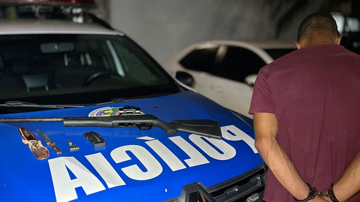 Além da faca e do rifle, os militares realizaram a apreensão de cinco munições calibres 22 e 38. Neste domingo (11/5), a prisão em flagrante foi convertida em preventiva após audiência de custódia.
