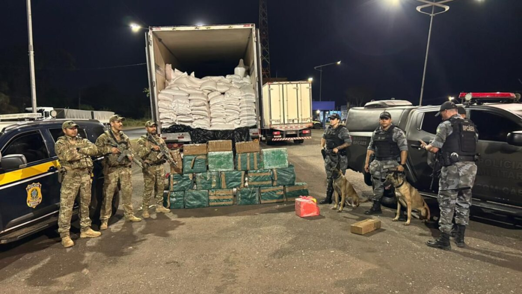 Diante da suspeita, os cães farejadores foram acionados e rapidamente localizaram os tabletes de cocaína escondidos sob as sacas do grão. A ação foi coordenada pelas equipes da Polícia Rodoviária Federal (PRF) com o apoio do Batalhão de Policiamento com Cães (BPCães) da Polícia Militar.
