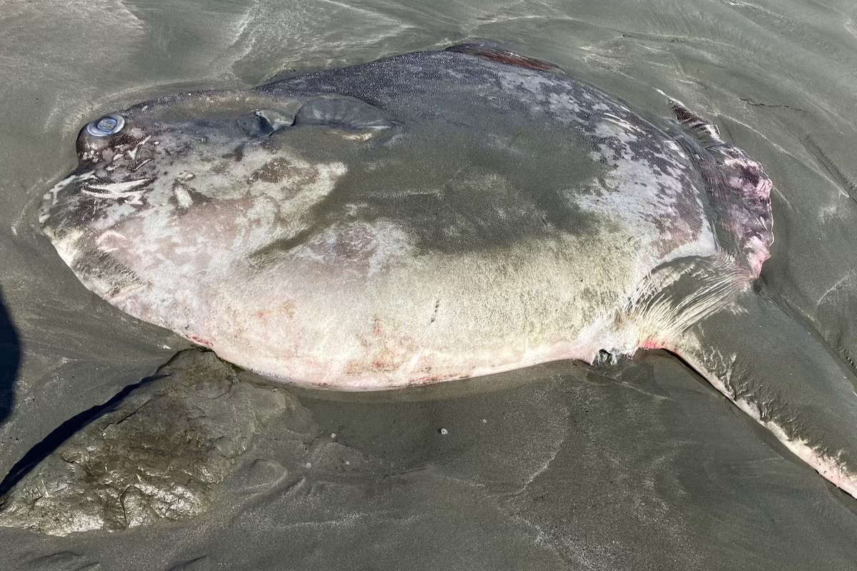 Um peixe-lua de quase dois metros de comprimento foi encontrado encalhado na areia do Parque Regional Doran, na costa de Bodega Bay, na Califórnia, nos Estados Unidos.