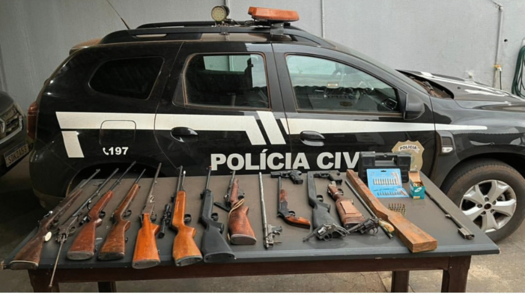 Entre as armas apreendidas estão espingardas de pressão que, segundo a polícia, possivelmente eram adulteradas para efetuarem disparos com munições de armas de fogo.
