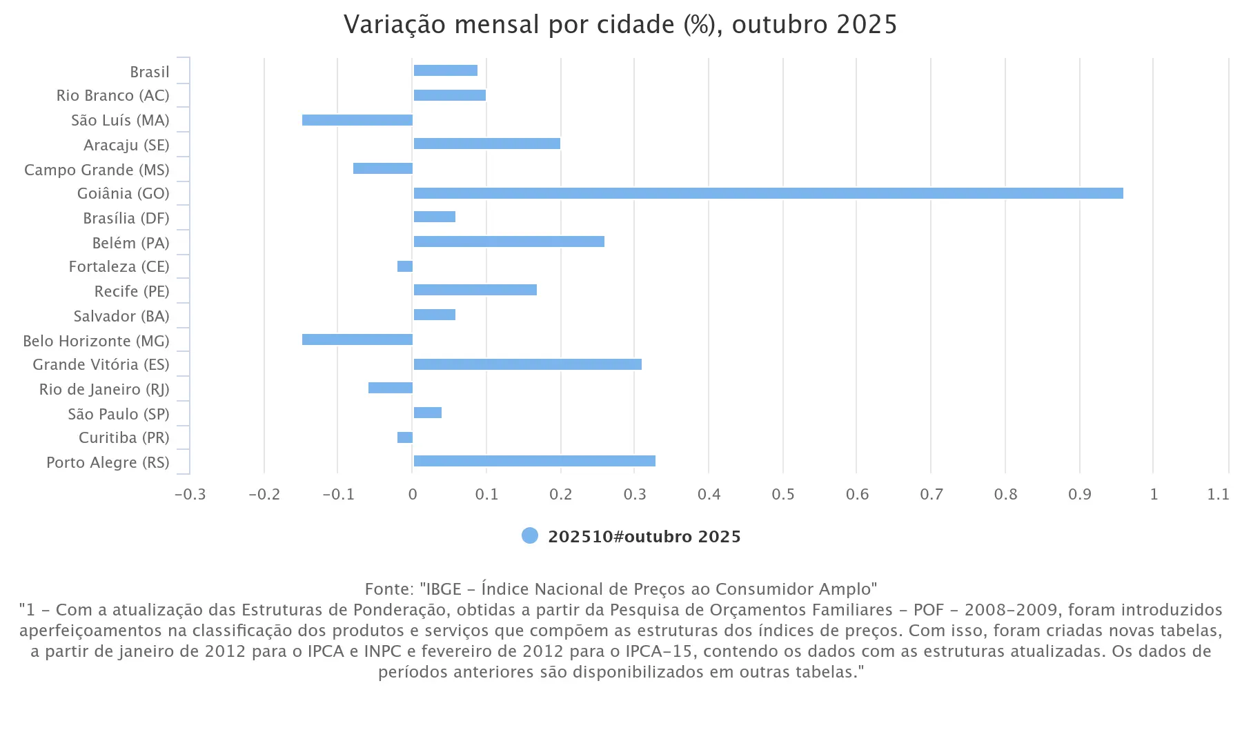 São Luiz (MA), por sua vez, foi a cidade com melhor desempenho em outubro. A variação foi de -0,15. A cidade é seguida por: Belo Horizonte (MG), com -0,15; Campo Grande (MS), com – 0,08%, Rio de Janeiro (RJ), com -0,06; e Curitiba (PR), com -0,02. Veja o gráfico: